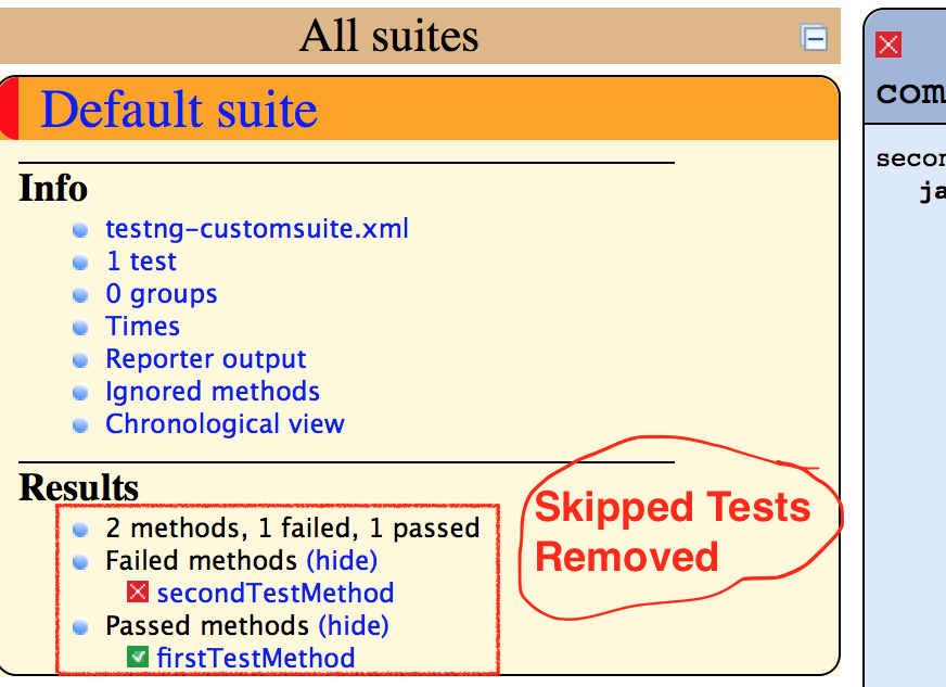 that were ran and you can retrieve these results using methods like getPassedTests(), getFailedTests() etc. We are going to override the onFinish(ITestContext context) method in our class and then check for the Skipped test and remove those from the context before TestNg generates the Report.